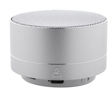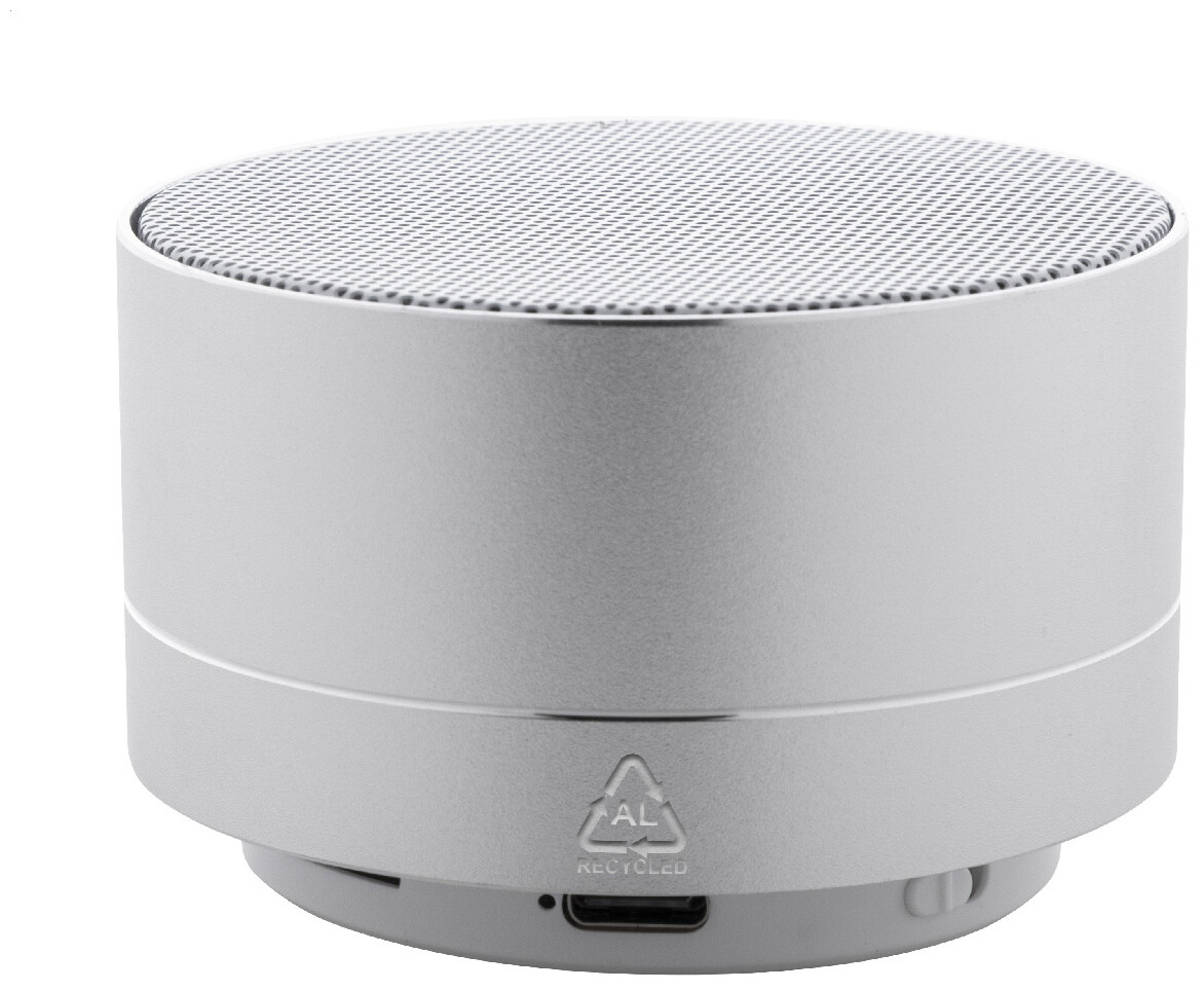 Bezdrátový reproduktor z recyklovaného hliníku s kovovou síťovinou, LED světlem na spodní straně a dobíjecí baterií (300 mAh). S funkcí handsfree hovorů a přehrávání MP3 z micro SD karty. Včetně nabíjecího kabelu USB.