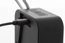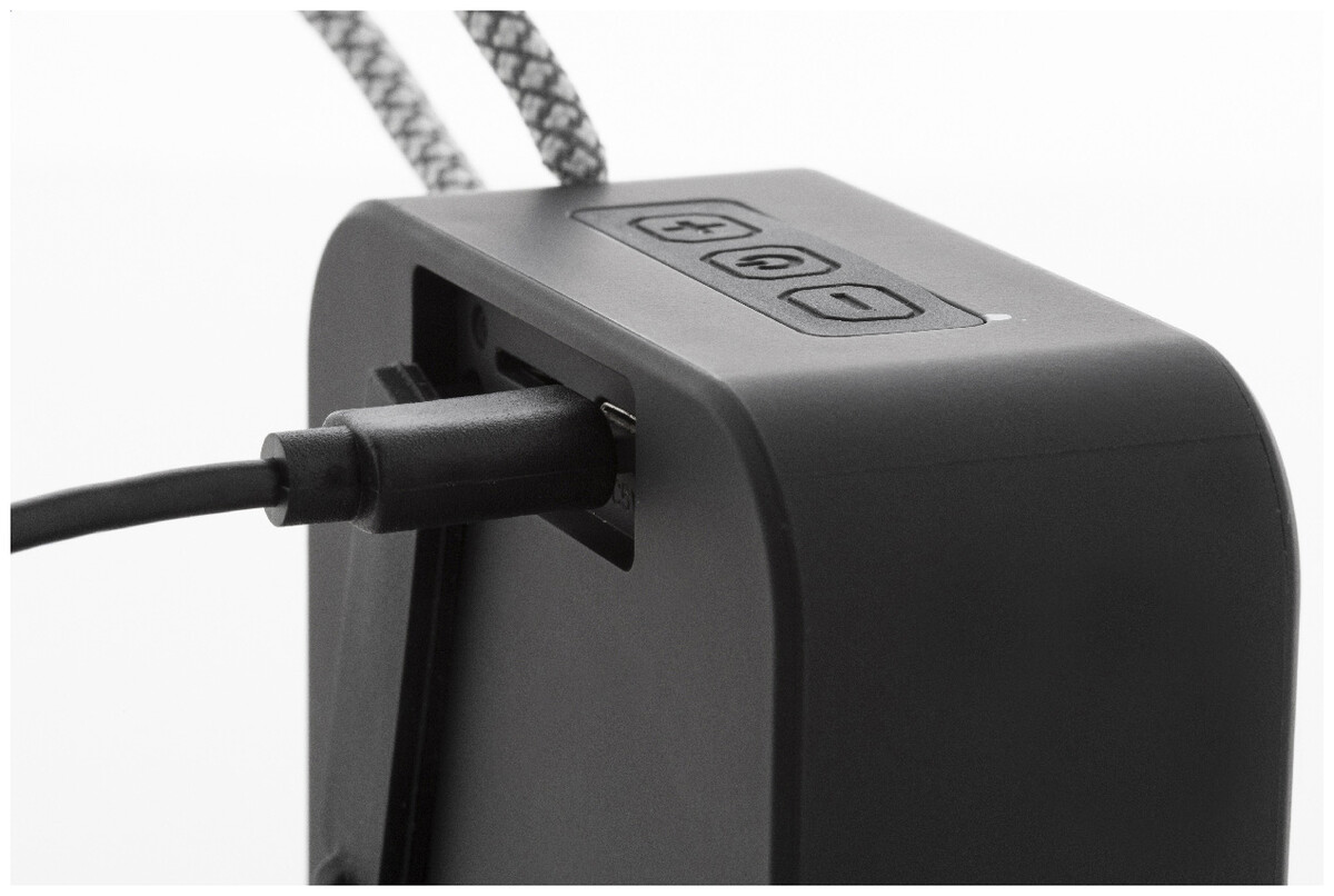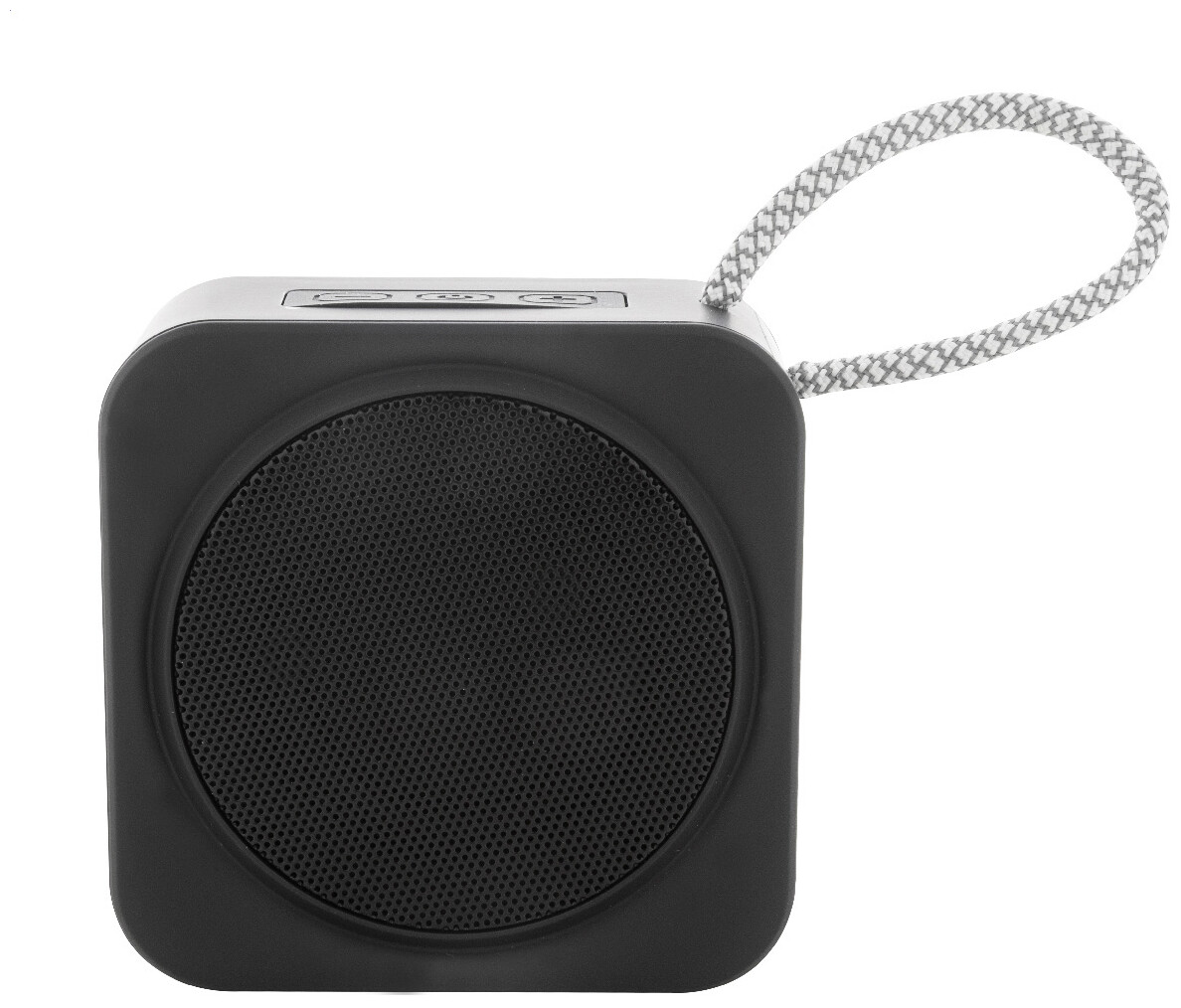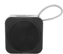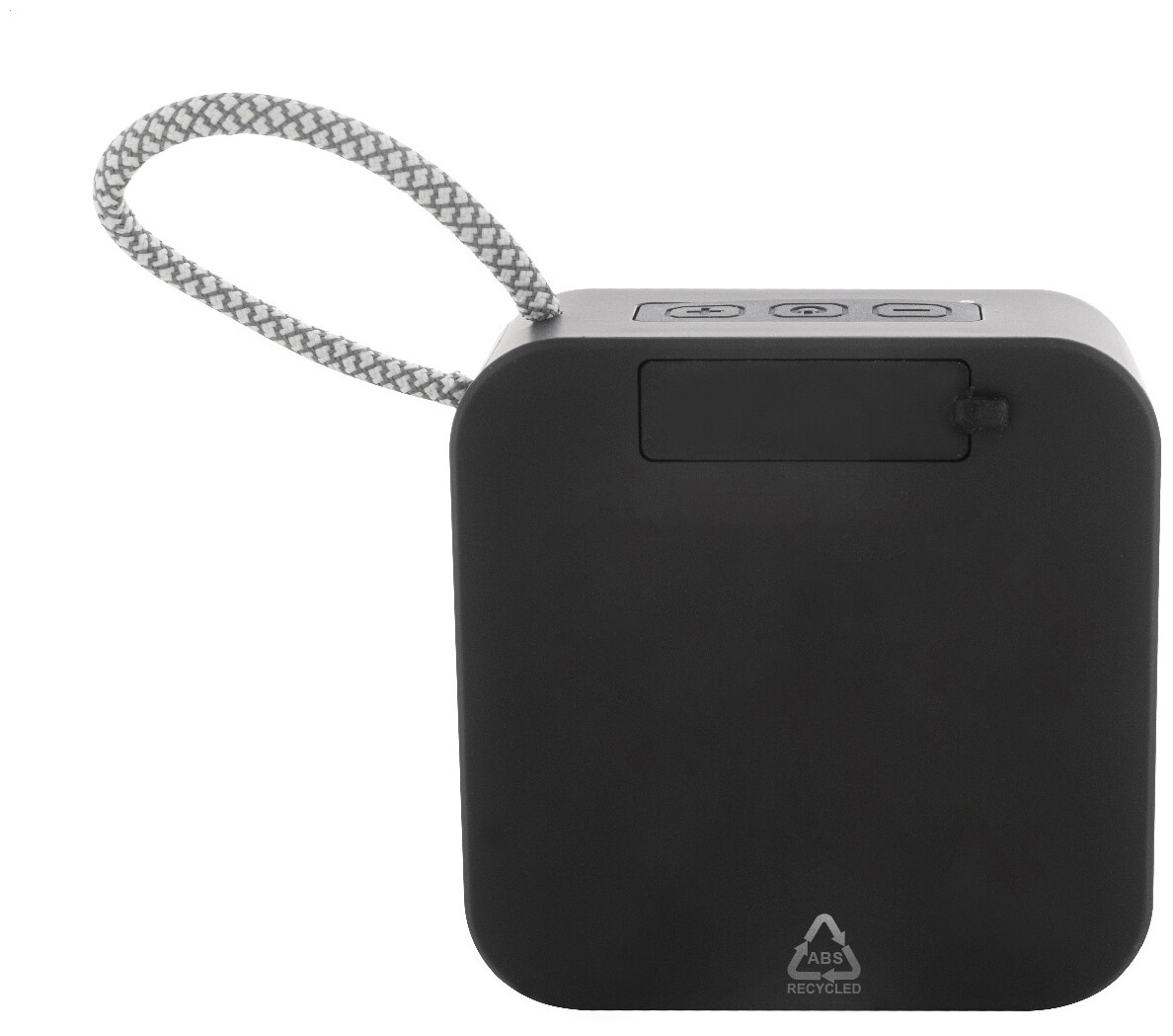 Bezdrátový reproduktor z recyklovaného ABS s popruhem na nošení, kovovou síťovinou a dobíjecí baterií (300 mAh). S funkcí přehrávání MP3 karet micro SD. Včetně nabíjecího kabelu USB.