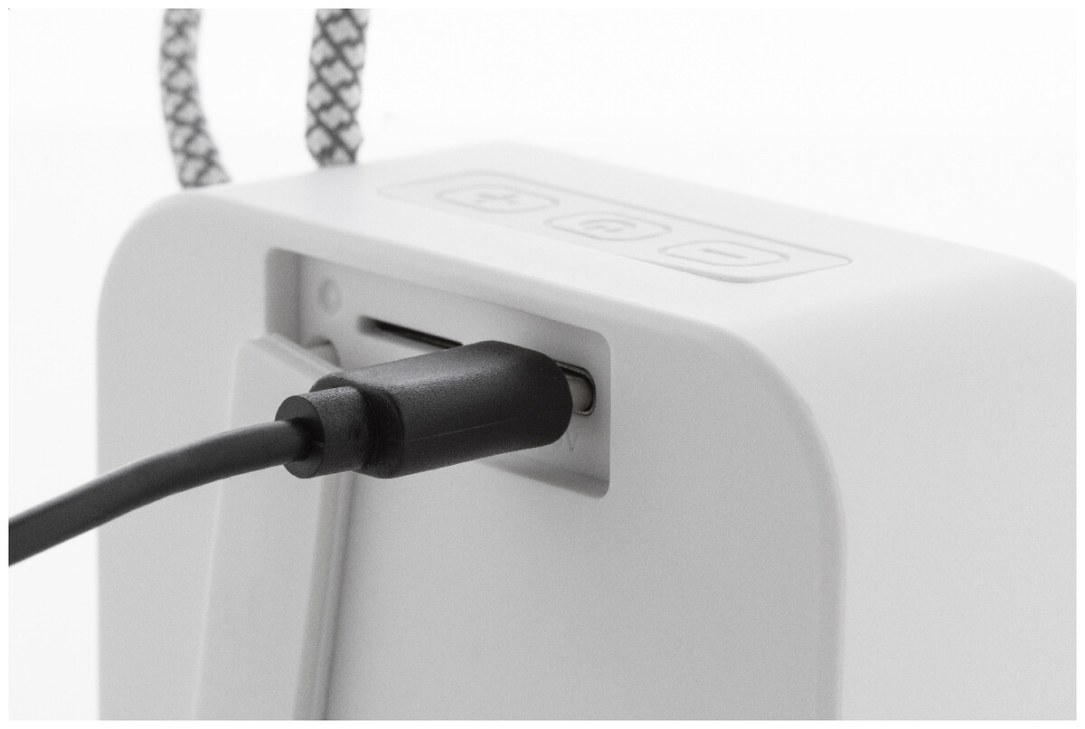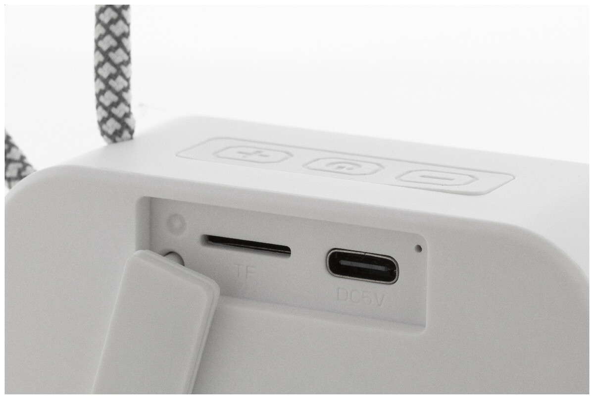 Bezdrátový reproduktor z recyklovaného ABS s popruhem na nošení, kovovou síťovinou a dobíjecí baterií (300 mAh). S funkcí přehrávání MP3 karet micro SD. Včetně nabíjecího kabelu USB.