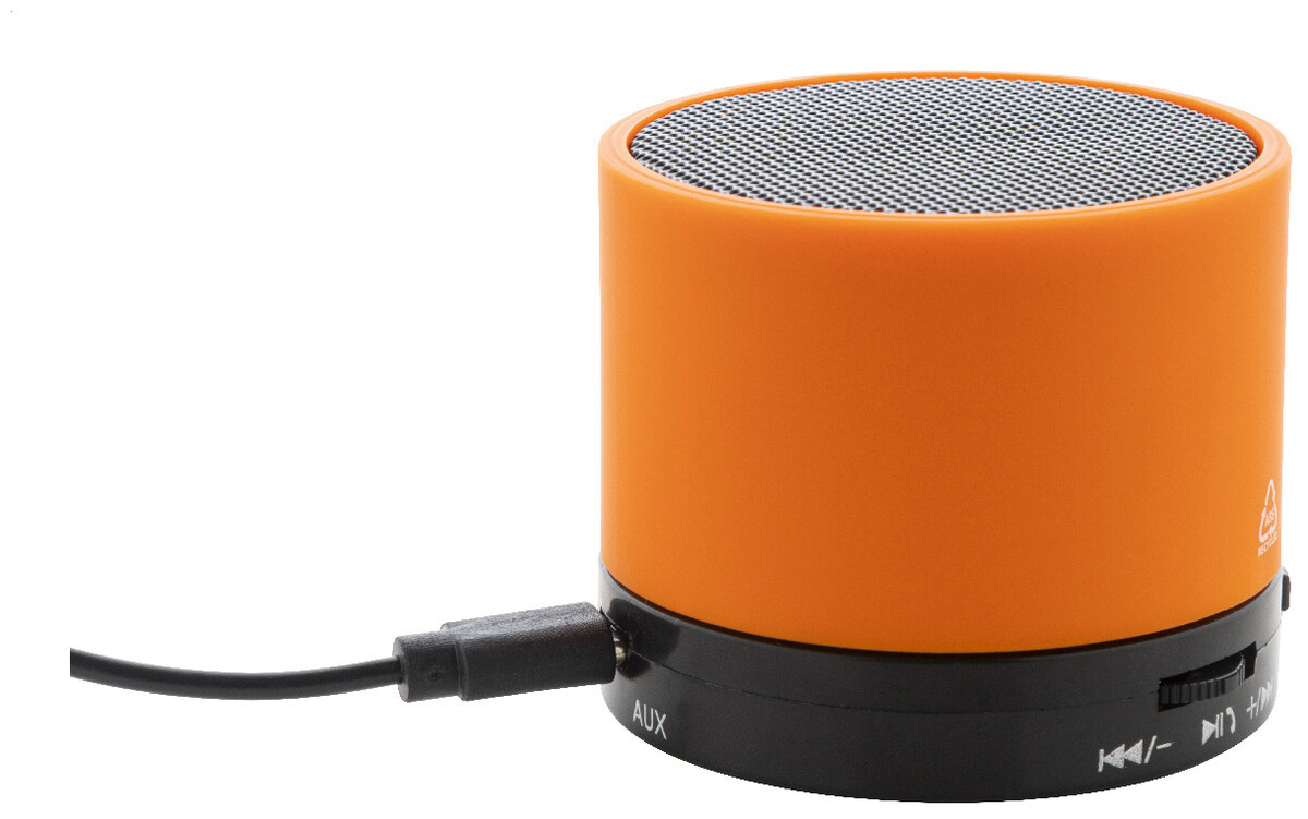 Bezdrátový reproduktor z recyklovaného ABS v pogumovaném pouzdře s kovovou síťovinou a dobíjecí baterií (300 mAh). S funkcí handsfree hovorů a přehrávání MP3 z micro SD karty. Včetně nabíjecího kabelu USB.