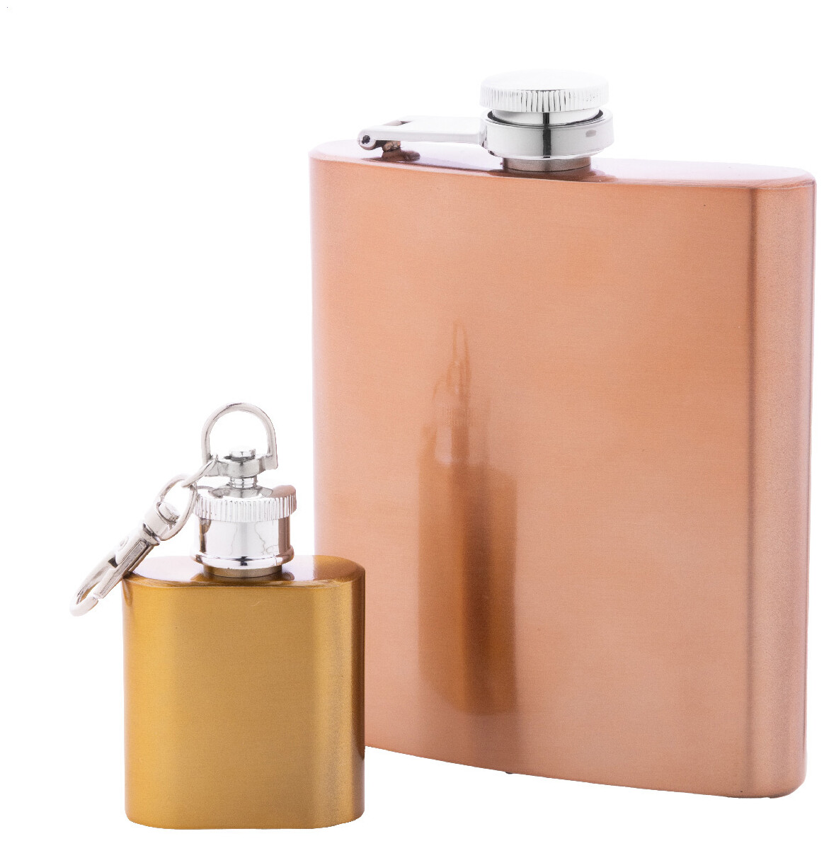 Mini butylka z recyklované nerezové oceli s lesklým kovovým povrchem a karabinou na klíče. 30 ml.