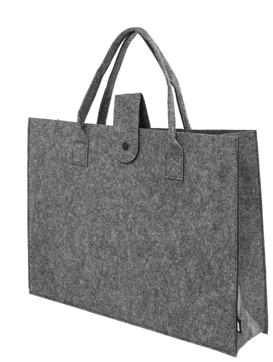 Nákupní taška z RPET plsti s klínkem, zapínáním na knoflíky a krátkými uchy. S výraznou etiketou z RPET.