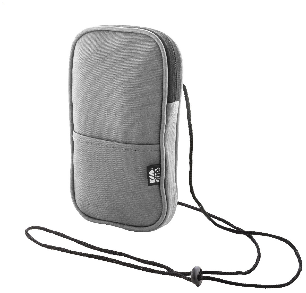 Voděodolná RPET crossbody taška na mobilní telefon s hlavní přihrádkou na zip, přední kapsou a nastavitelnou šňůrkou. Polyester RPET 600D potažený PU, s výrazným štítkem RPET.