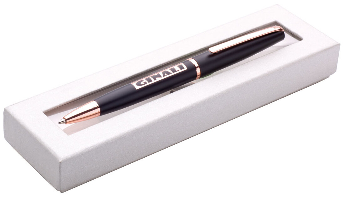 kovová propiska v dárkové krabičce s průhledným okénkem.