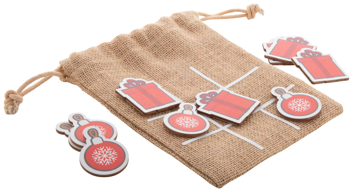 Piškvorky s vánočním designem z březové překližky s 10 žetony a jutovým pytlíkem.