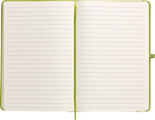 Zápisník A5 v zelených světlých deskách z PU materiálu má 80 linkovaných listů. Blok má uzavírací gumičku, poutko na propisku a textilní záložku v barvě desek.