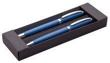 Dárková sada s modrou propiskou a rollerem v černé papírové krabičce.