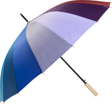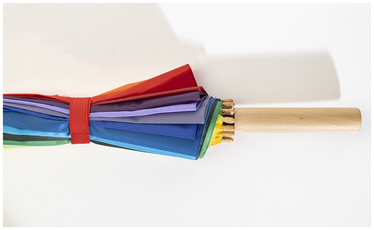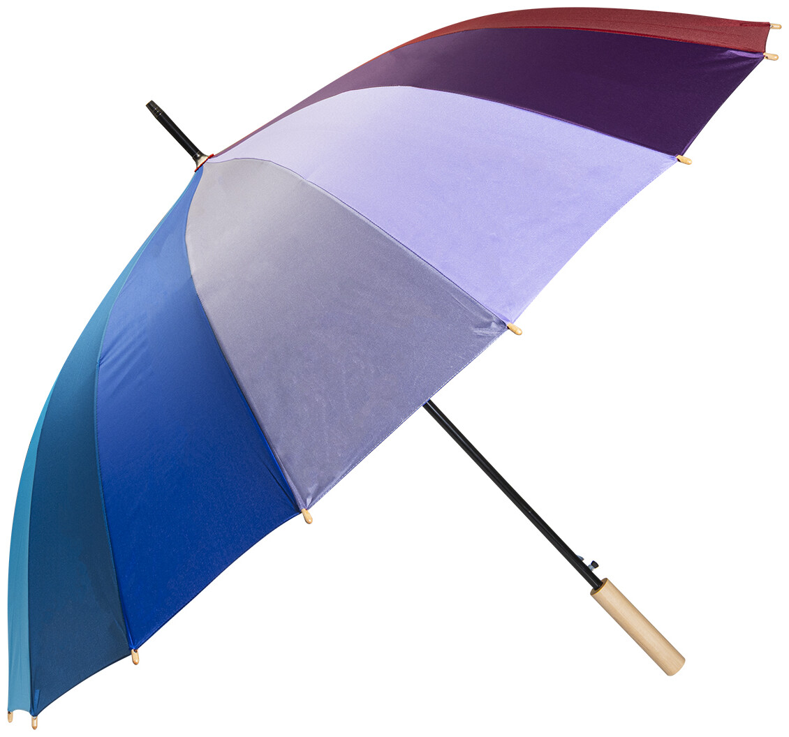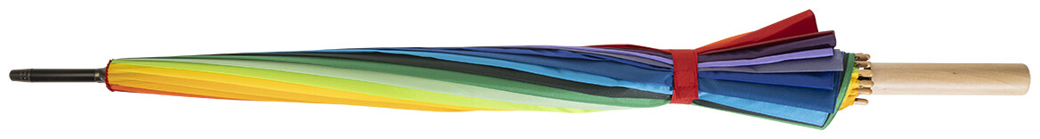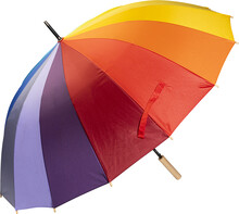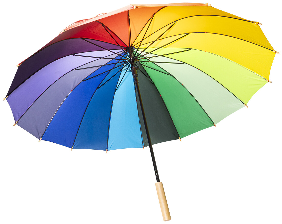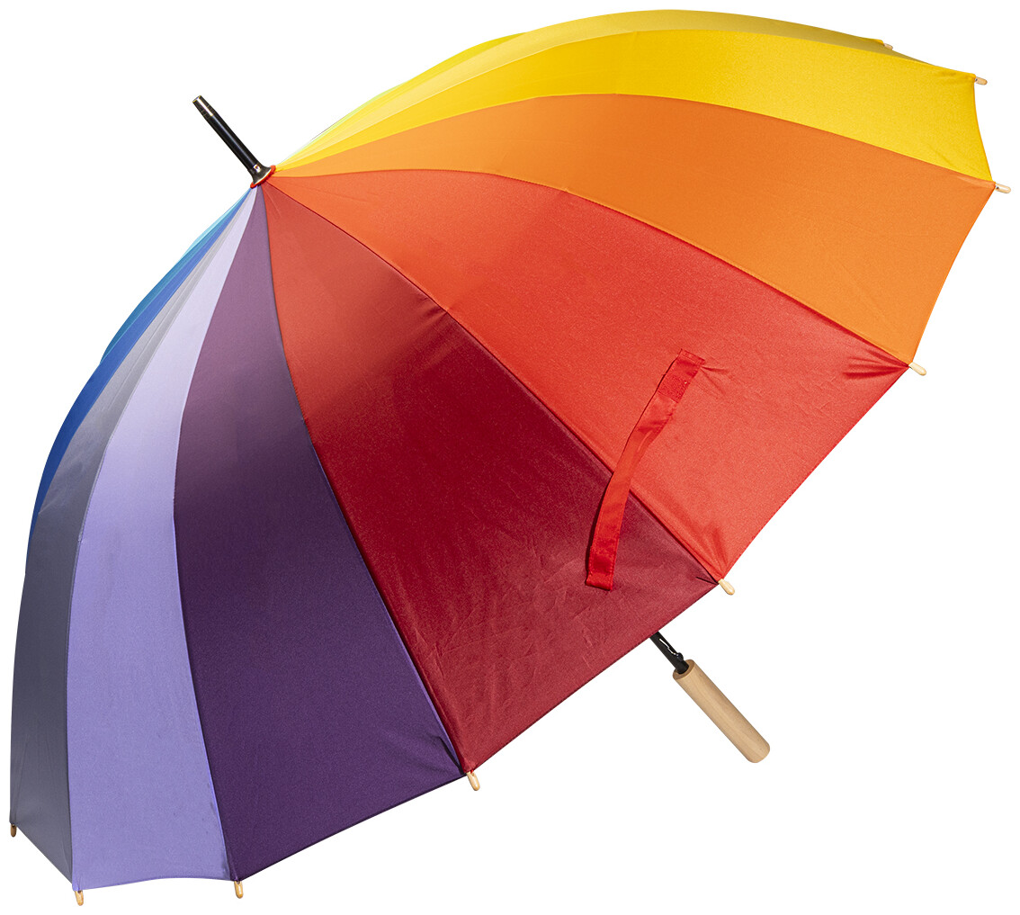 Velký automatický větruodolný deštník s 16 duhovými panely. S dřevěnou rukojetí, kovovým rámem a žebry ze skelných vláken. 190T pongee.