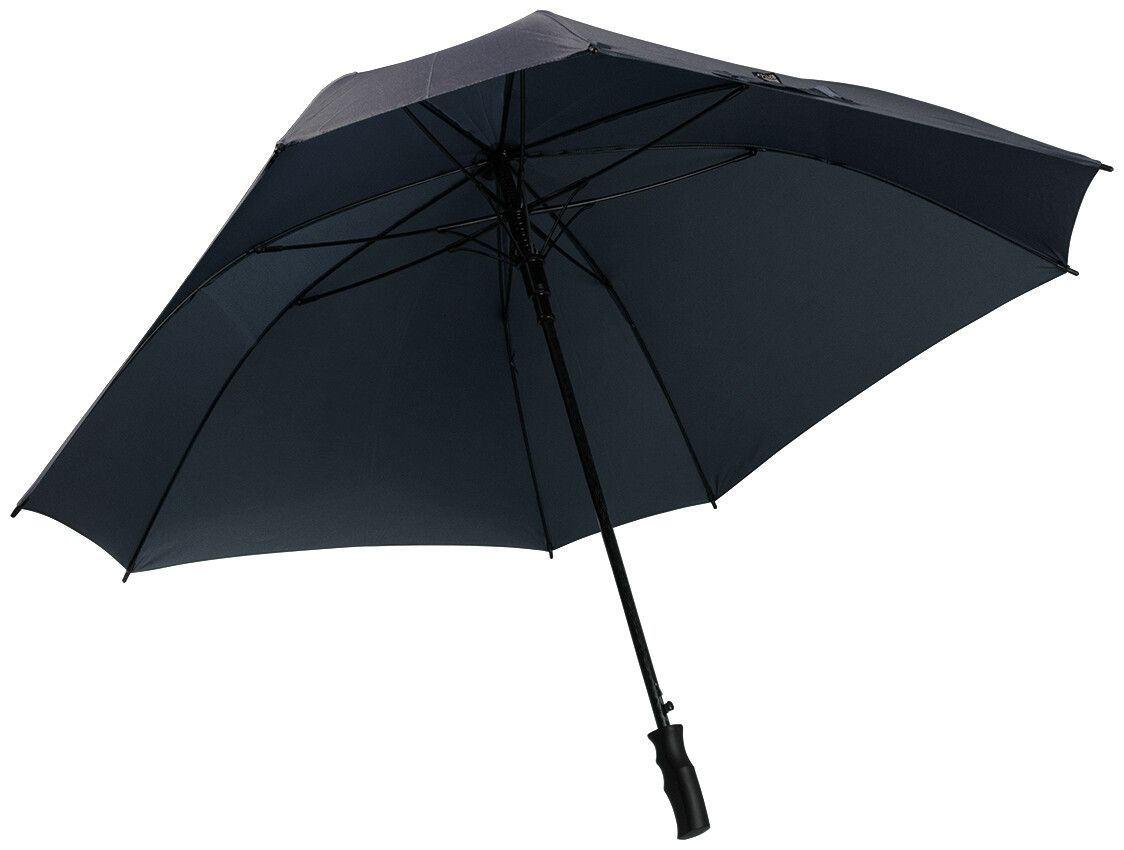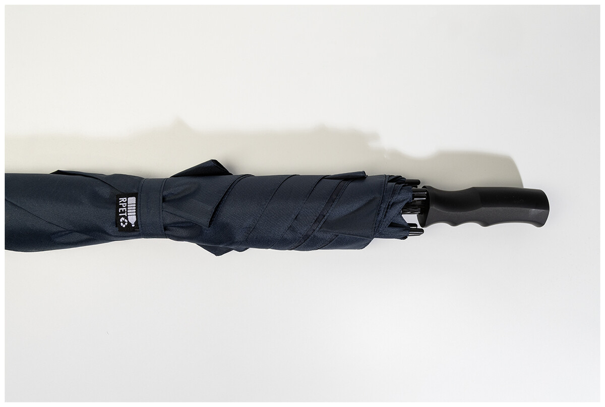 Velký automatický větruodolný čtvercový deštník s celolaminátovou tyčí a rámem, pogumovanou ABS rukojetí. 190T RPET pongee. S charakteristickým RPET štítkem.