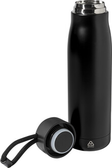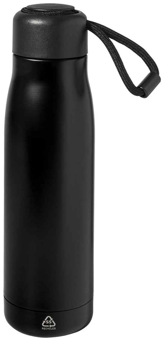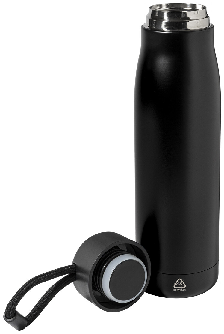 Dvoustěnná, vakuově izolovaná láhev z recyklované nerezové oceli s PP víčkem a integrovaným poutkem na nošení se šňůrkou. 500 ml.