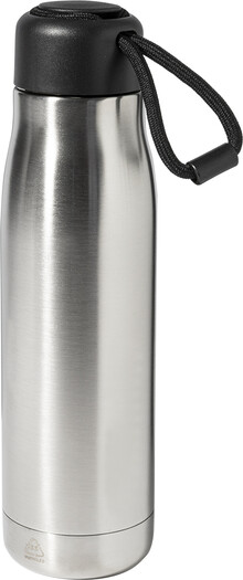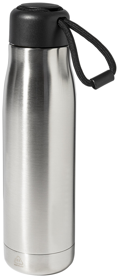 Dvoustěnná, vakuově izolovaná láhev z recyklované nerezové oceli s PP víčkem a integrovaným poutkem na nošení se šňůrkou. 500 ml.