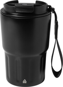 Dvoustěnný termo hrnek z recyklované nerezové oceli s izolačním víčkem z PP. S poutkem z RPET polyesteru. 350 ml.