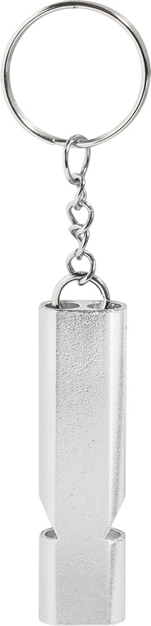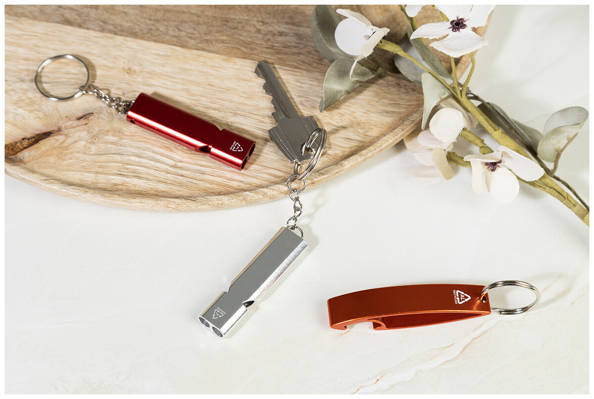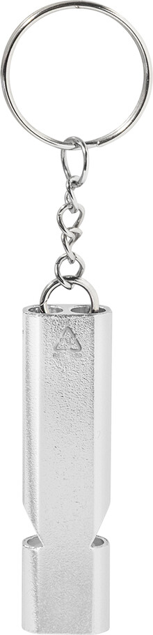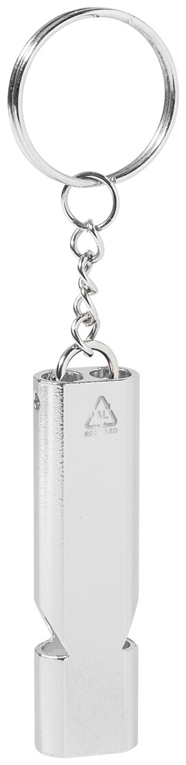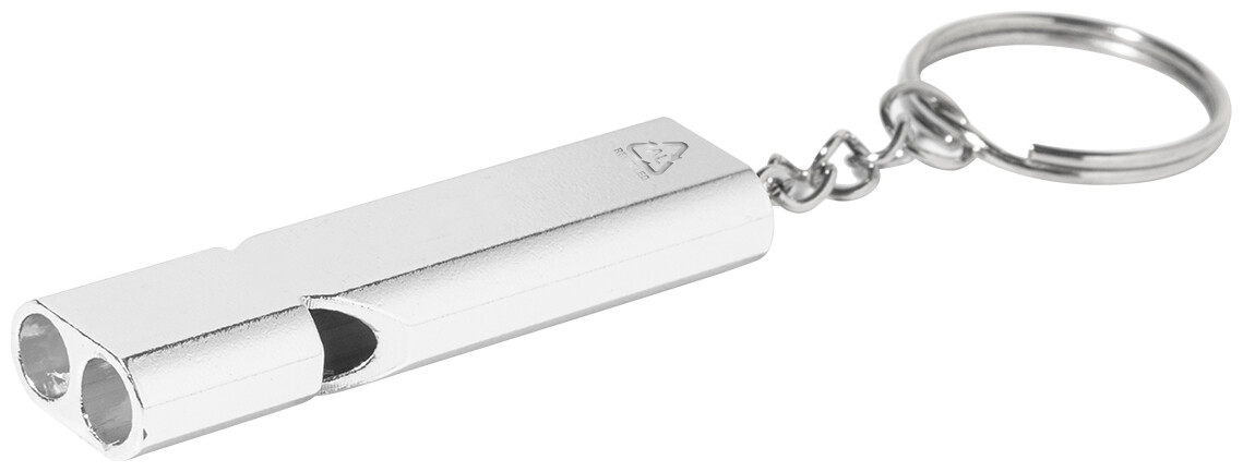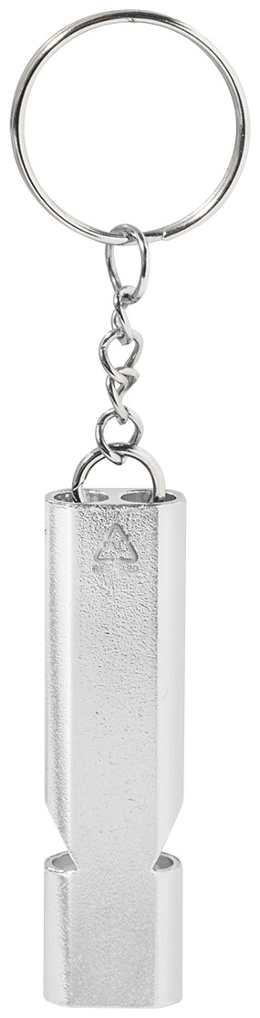 Píšťalka z recyklovaného hliníku s kovovým kroužkem na klíče.