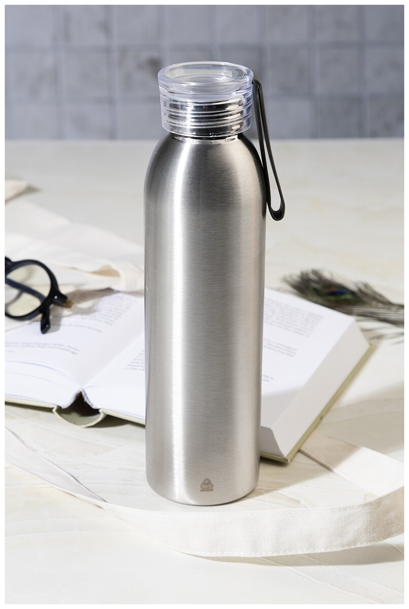 Láhev z recyklované nerezové oceli s PP víčkem a silikonovým poutkem, 600 ml.