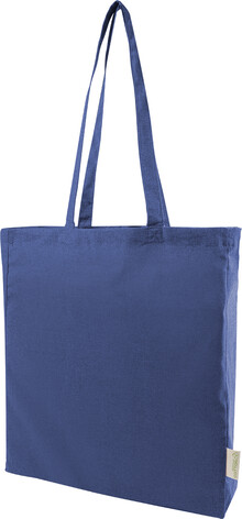 Nákupní taška s klínkem a dlouhými uchy ze 70 % recyklované bavlny a 30 % RPET polyesteru, 140 g/m2. S výraznou etiketou o recyklované bavlně.