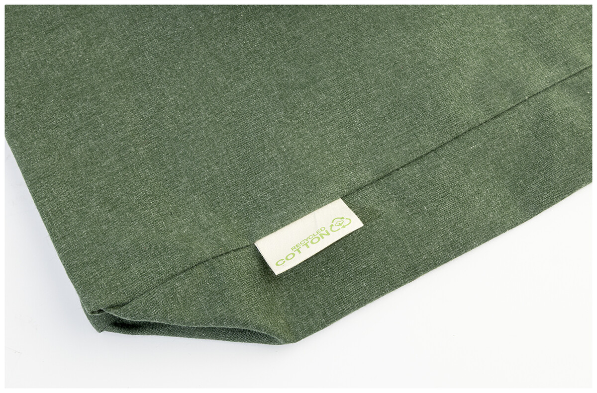 Nákupní taška s klínkem a dlouhými uchy ze 70 % recyklované bavlny a 30 % RPET polyesteru, 140 g/m2. S výraznou etiketou o recyklované bavlně.