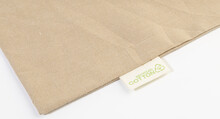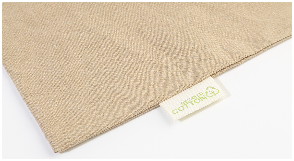 Nákupní taška s dlouhými uchy ze 70 % recyklované bavlny a 30 % RPET polyesteru, 140 g/m2. S výraznou etiketou o recyklované bavlně.