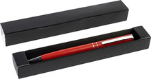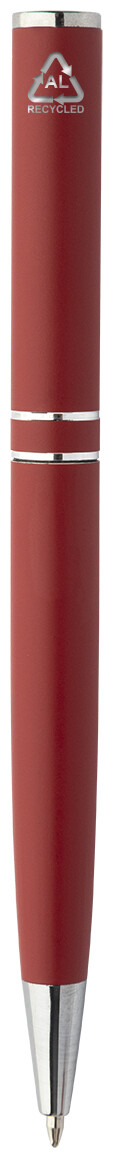 Kuličkové pero z recyklovaného hliníku s chromovanými částmi a kroužky. V černé dárkové krabičce. S modrou náplní.
