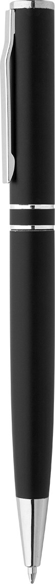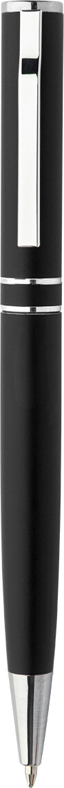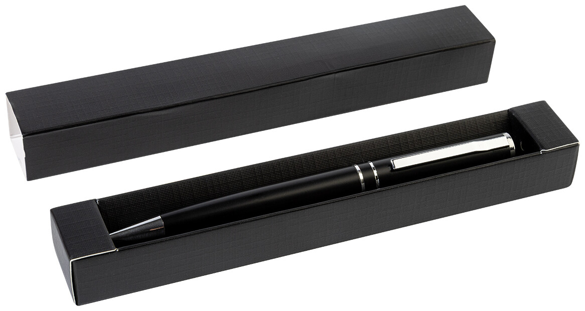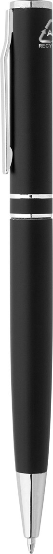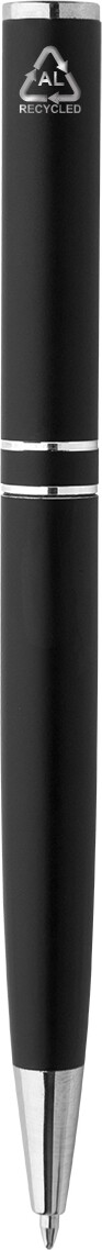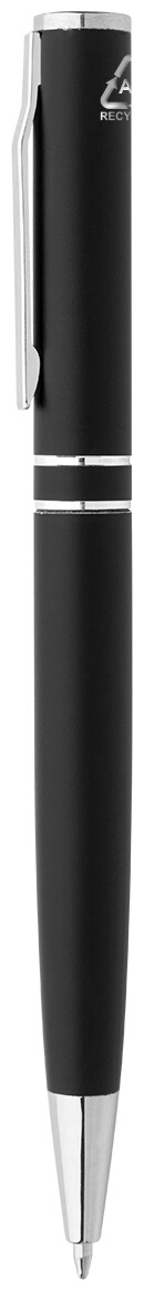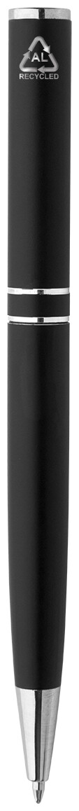 Kuličkové pero z recyklovaného hliníku s chromovanými částmi a kroužky. V černé dárkové krabičce. S modrou náplní.