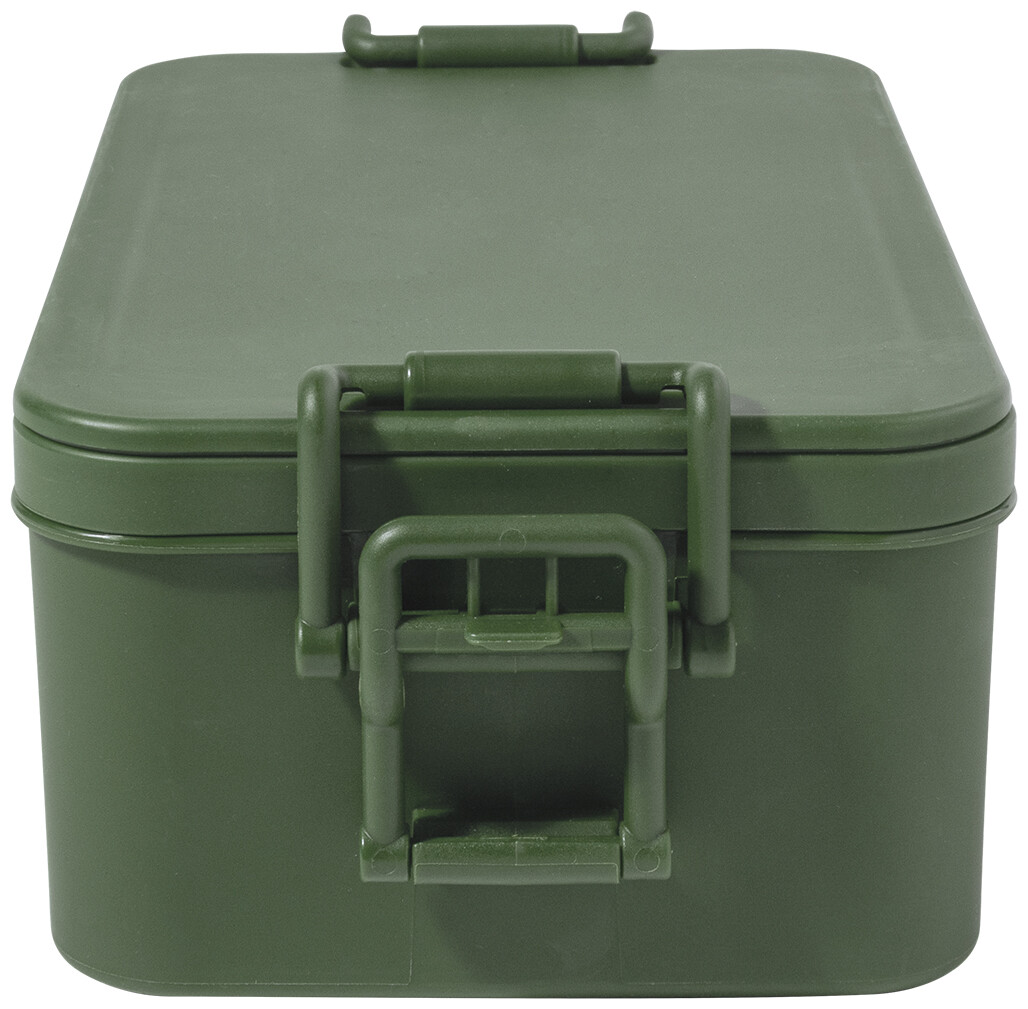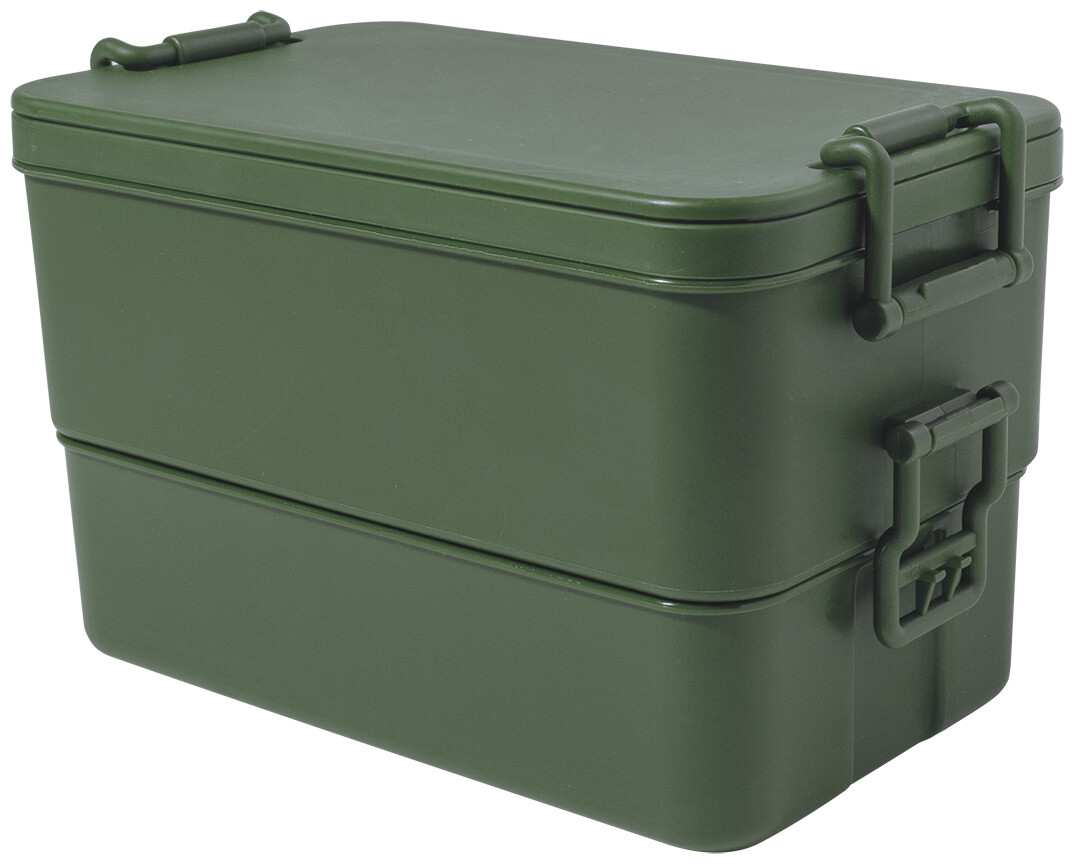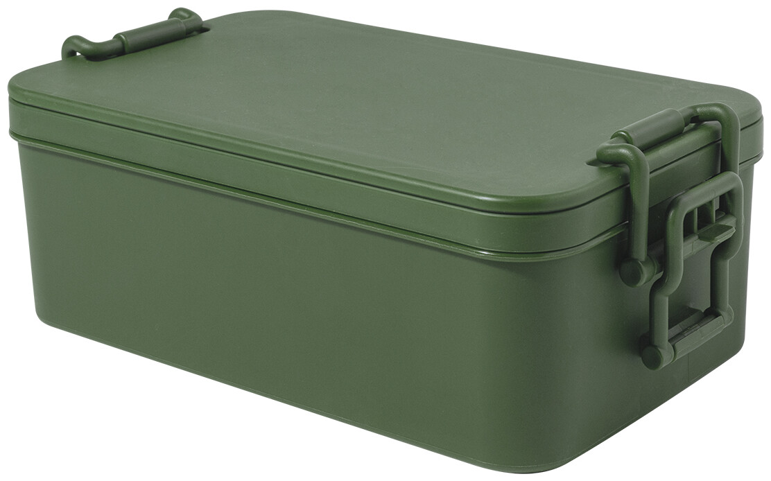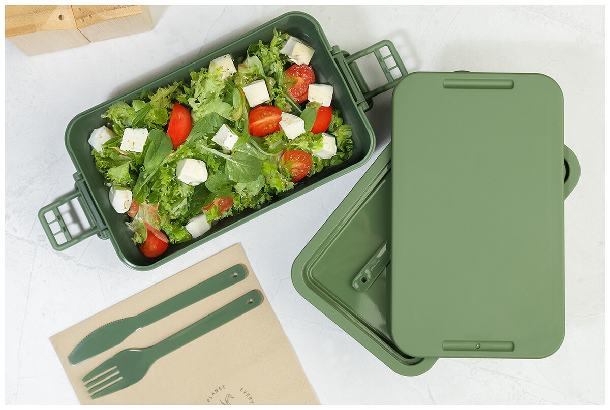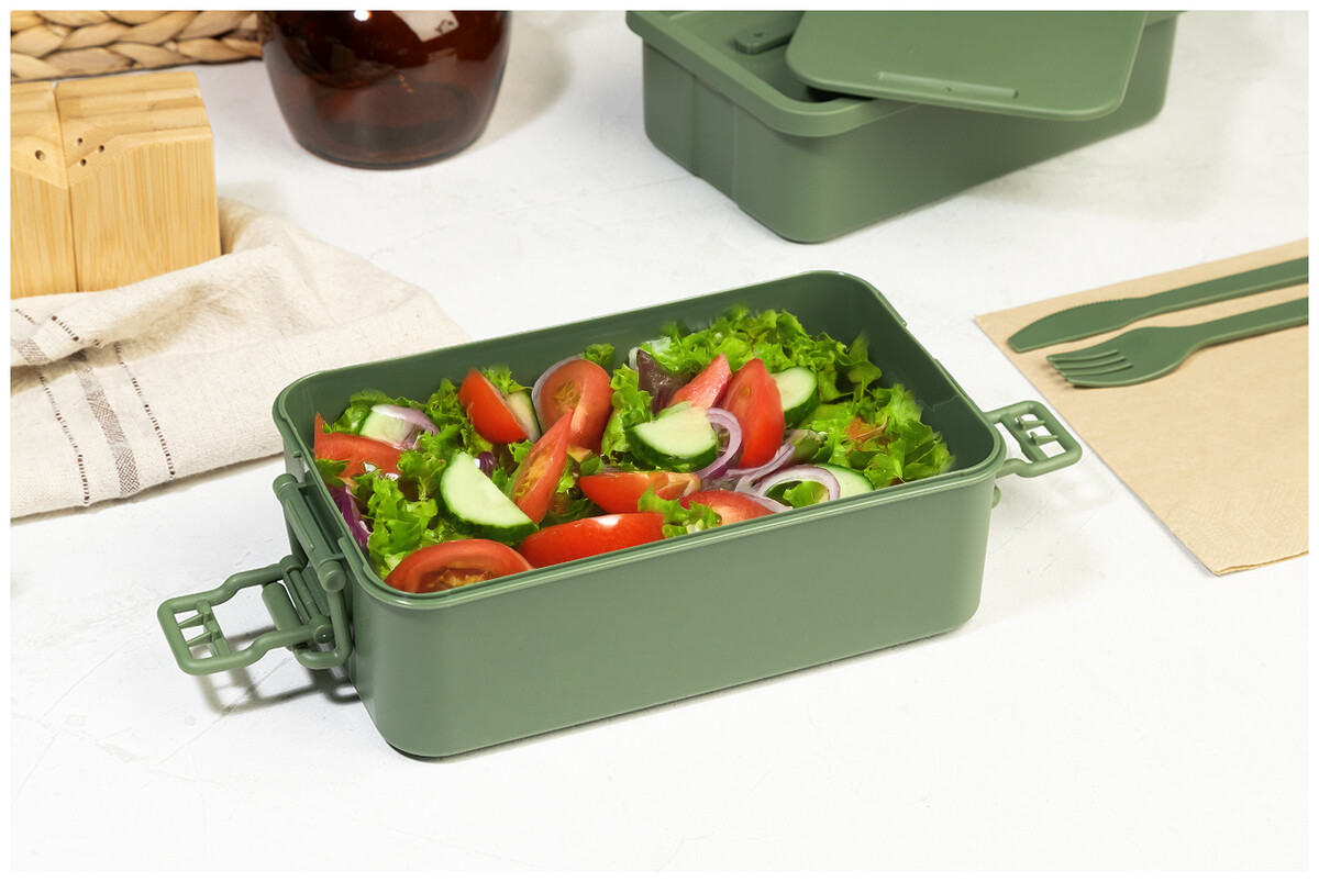 Box na jídlo z PP plastu se sadou příborů (vidlička, lžíce a nůž), zapínáním na přezku a 2 přihrádkami (1000 ml a 800 ml). Stohovatelný design pro kompaktní skladování.
