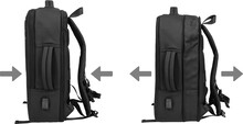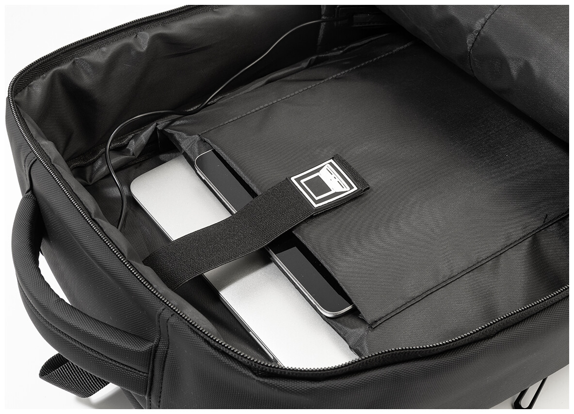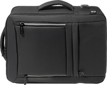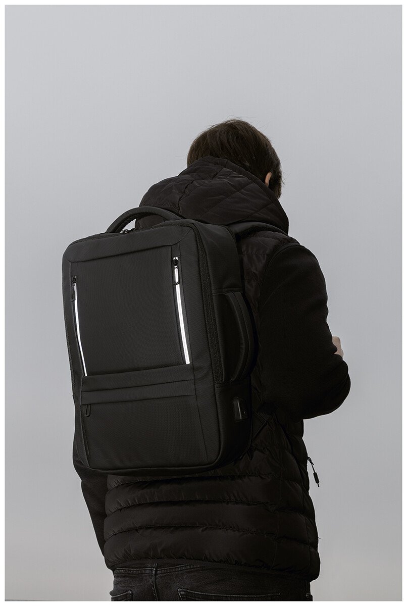 Voděodolný batoh a taška na dokumenty z RPET s možností prodloužení a hlavní přihrádkou na zip, předními kapsami s reflexními zipy, polstrovanou přihrádkou na notebook (15") a tablet (12") a vestavěným USB portem pro power banky. S popruhem na kufry, polstrovanými zády a ramenními popruhy s hrudním popruhem. Polyester 600D RPET s PU zátěrem a výrazným štítkem RPET.