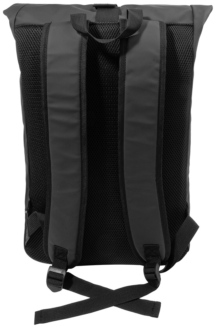 Voděodolný batoh s rolovacím vrškem z měkké recyklované PU kůže s hlavní přihrádkou na zip a zapínáním na přezku, přední kapsou s voděodolným zipem, polstrovanou přihrádkou na notebook (15") a reflexním proužkem. S polstrovanými zády a ramenními popruhy. S výraznou nálepkou z recyklované PU kůže.