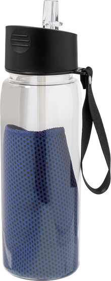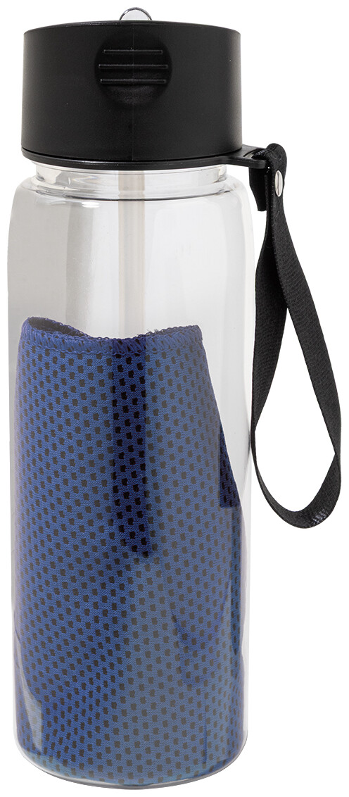 Chladicí sportovní ručník z RPET polyesteru v RPET sportovní lahvi s PP víčkem typu flip-top, integrovaným brčkem a přenosným popruhem. Objem 800 ml. Neobsahuje BPA. Není vhodná pro sycené nápoje. Velikost ručníku: 30 × 80 cm.
