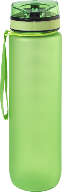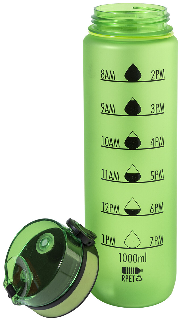 Sportovní láhev z matného RPET s motivačním objemovým a časovým značením, s automaticky otevíratelným odklápěcím víčkem s bezpečnostním zámkem a poutkem na nošení. 1000 ml. Bez BPA. Nevhodné pro sycené nápoje.
