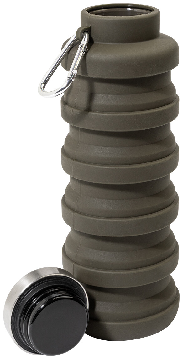 Skládací silikonová láhev s víčkem z nerezové oceli a hliníkovou karabinou. 500 ml