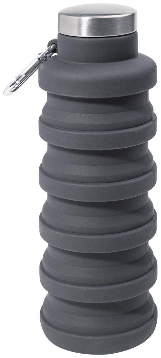 Skládací silikonová láhev s víčkem z nerezové oceli a hliníkovou karabinou. 500 ml
