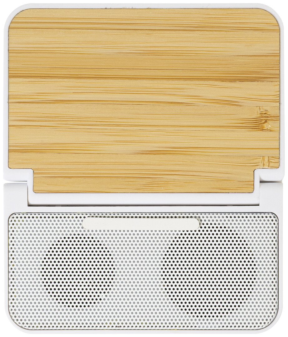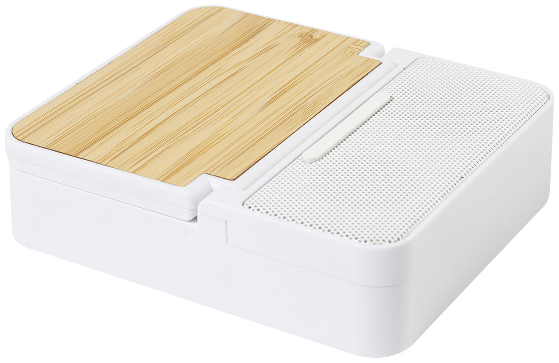 Bezdrátový reproduktor z recyklovaného ABS plastu s držákem na mobil potaženým bambusem a vestavěnou bezdrátovou rychlonabíječkou (15 W). S vestavěnou dobíjecí baterií (1200 mAh). Včetně nabíjecího kabelu USB.