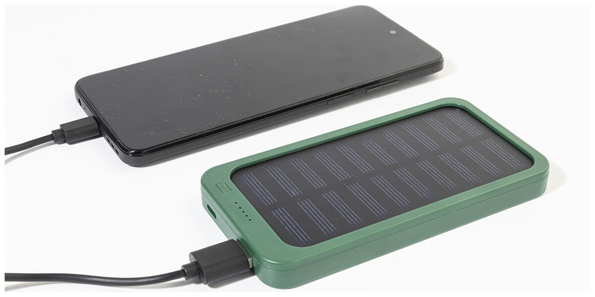 Power banka z recyklovaného ABS plastu s vestavěnou solární nabíječkou a baterií 4000 mAh. S 1 USB a 1 USB-C portem pro nabíjení. Vstupní port USB-C. Včetně nabíjecího kabelu USB.