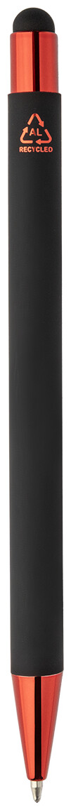 Kuličkové pero z recyklovaného hliníku na dotykovou obrazovku, s černým pogumovaným tělem a barevnými lesklými kovovými částmi. Se speciálním povrchem pro zrcadlové gravírování, které ladí s kovovými částmi. S modrou náplní.