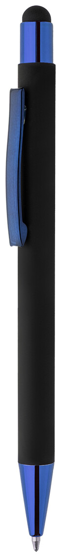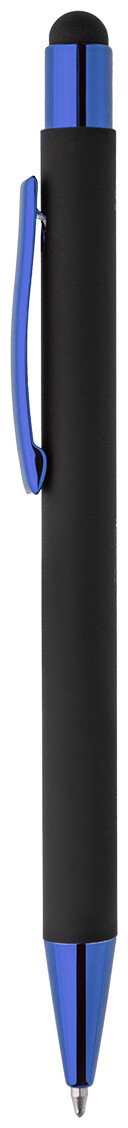 Kuličkové pero z recyklovaného hliníku na dotykovou obrazovku, s černým pogumovaným tělem a barevnými lesklými kovovými částmi. Se speciálním povrchem pro zrcadlové gravírování, které ladí s kovovými částmi. S modrou náplní.