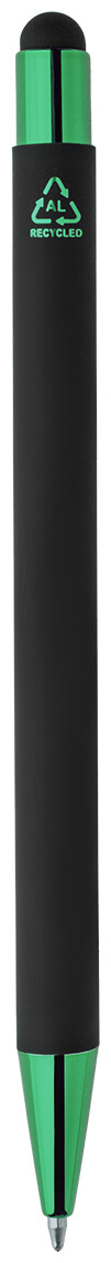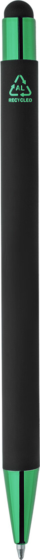 Kuličkové pero z recyklovaného hliníku na dotykovou obrazovku, s černým pogumovaným tělem a barevnými lesklými kovovými částmi. Se speciálním povrchem pro zrcadlové gravírování, které ladí s kovovými částmi. S modrou náplní.