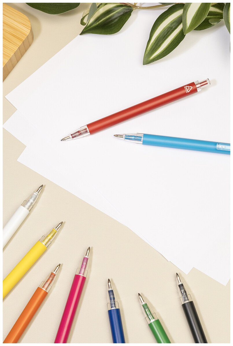 Kuličkové pero z recyklovaného hliníku s matným tělem a průhlednými RPET částmi. S modrou náplní.