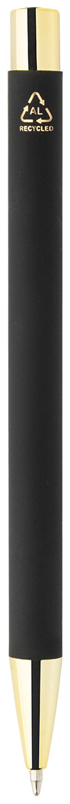 Kuličkové pero z recyklovaného hliníku s černým pogumovaným tělem a barevnými lesklými kovovými částmi. Se speciálním povrchem pro zrcadlové gravírování, které ladí s kovovými částmi. S modrou náplní.