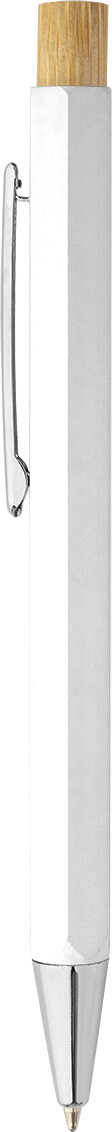 Šestihranné kuličkové pero z recyklovaného hliníku s bambusovým tlačítkem a chromovanými částmi. S modrou náplní.
