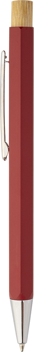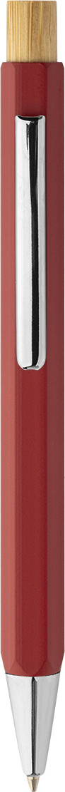 Šestihranné kuličkové pero z recyklovaného hliníku s bambusovým tlačítkem a chromovanými částmi. S modrou náplní.