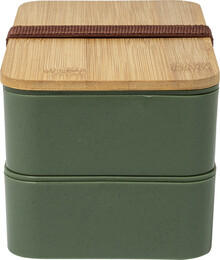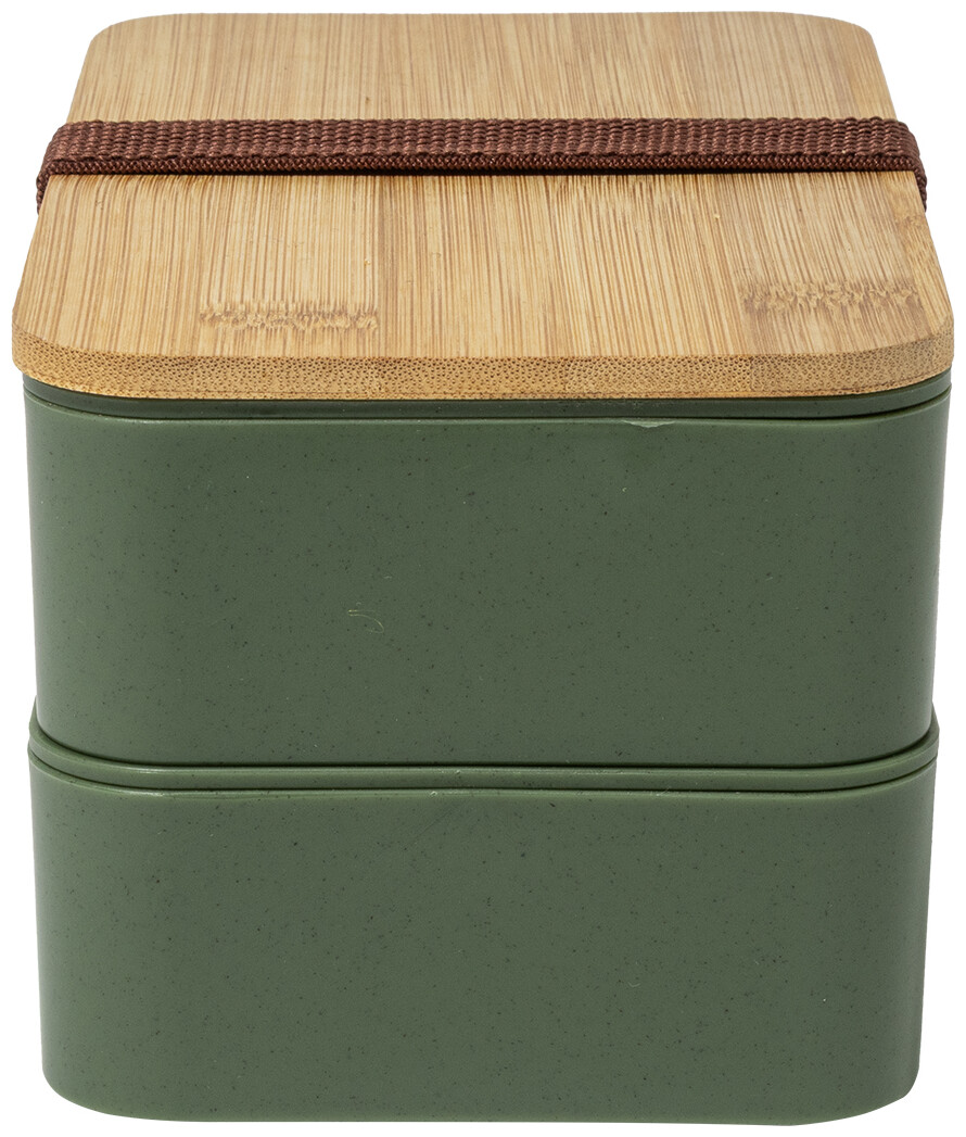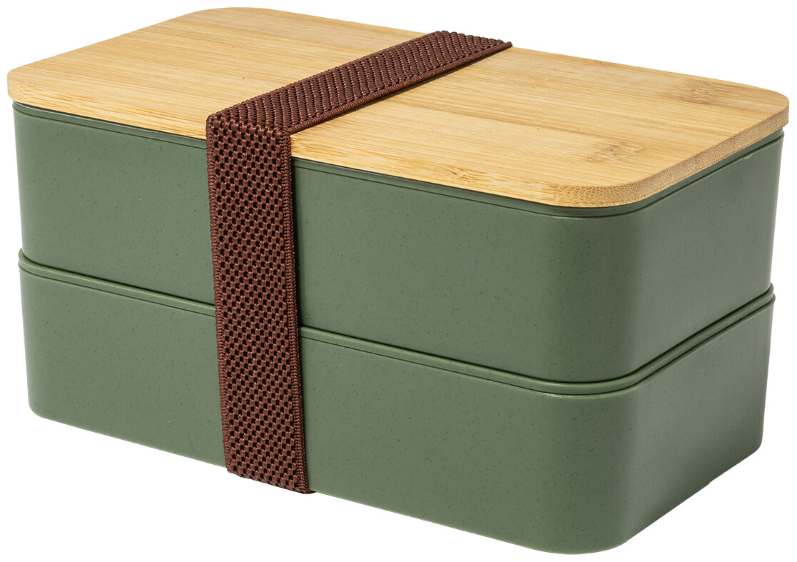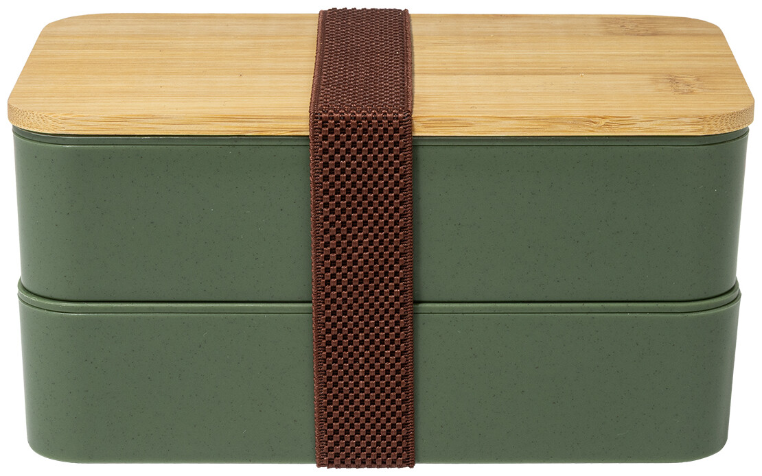 Box na jídlo z PP plastu se sadou příborů (vidlička, lžíce a nůž), bambusovým víkem a elastickým popruhem. Se 2 přihrádkami o objemu 700 ml.