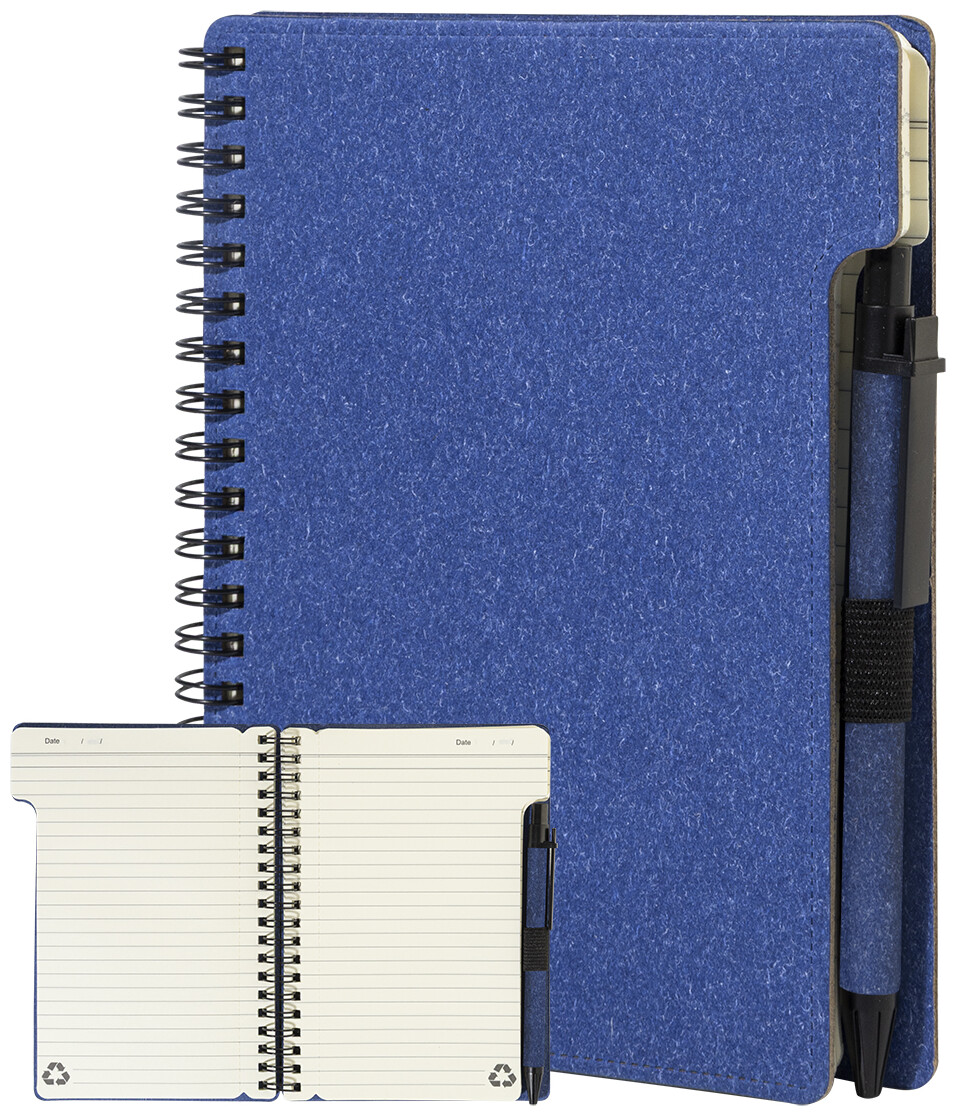 Spirálový blok A6 z recyklovaného papíru s 80 linkovanými listy. Včetně recyklovaného papíru a kuličkového pera z recyklovaného PP s modrou náplní.