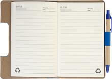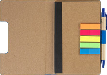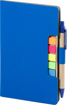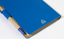 Blok s recyklovanou PU kůží, 70 linkovanými listy z recyklovaného papíru a 125 značkovači stránek (v 5 různých barvách). Včetně recyklovaného papíru a kuličkového pera z recyklovaného PP s modrou náplní.