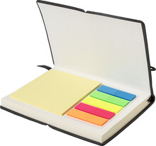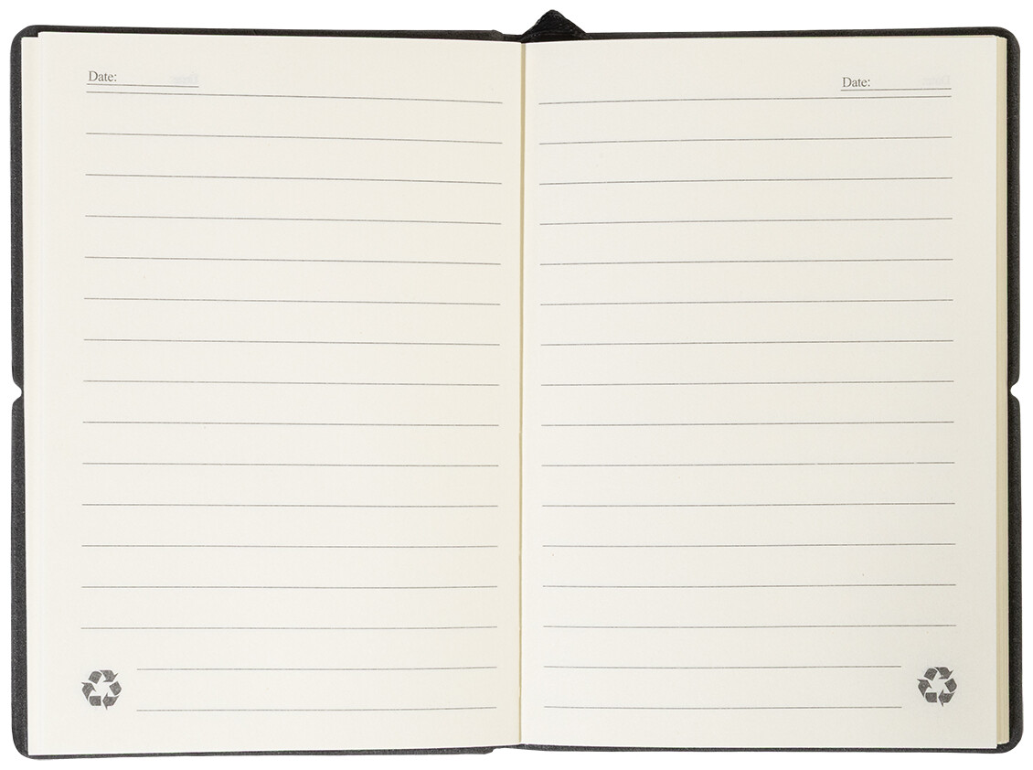 Blok A6 s recyklovanou PU kůží, 70 linkovanými listy z recyklovaného papíru, 25 samolepicími papírky a 125 značkovači stránek (v 5 různých barvách). Se záložkou a horizontálním gumovým páskem.
