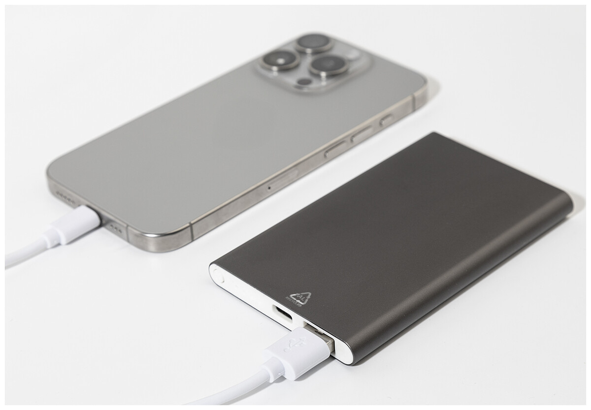 USB power banka v pouzdře z recyklovaného hliníku s 4000 mAh baterií. S 1 portem USB a 1 portem USB-C pro nabíječku. Vstupní port USB-C. Včetně USB nabíjecího kabelu.