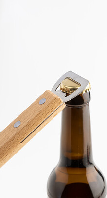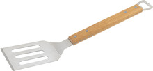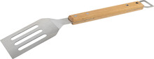 Nerezová grilovací špachtle s dřevěnou rukojetí a otvírákem na lahve.