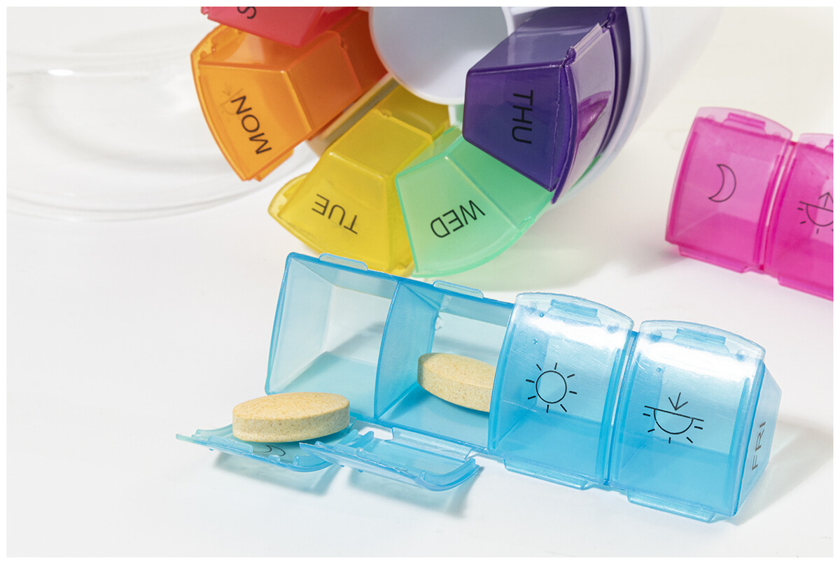 Sada týdenních krabiček na léky z recyklovaného ABS plastu se 7 denními krabičkami, každá se 4 přihrádkami pro různé denní doby. V kulatém stojanu s průhledným víkem.
