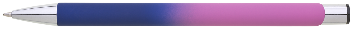 Hliníková propiska se stříbrnými doplňky a měkkým pogumovaným soft povrchem ve tmavě modro–růžovém přechodu. Náplň velkoobsahová, modře píšící.