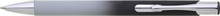 Hliníková propiska se stříbrnými doplňky a měkkým pogumovaným soft povrchem v šedo-černém přechodu. Náplň velkoobsahová, modře píšící.