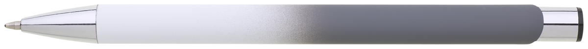 Hliníková propiska se stříbrnými doplňky a měkkým pogumovaným soft povrchem v bílo-šedém přechodu. Náplň velkoobsahová, modře píšící.