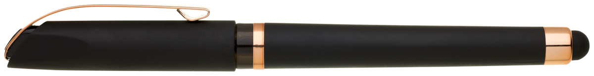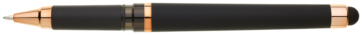 Gelová propiska s s víčkem a touch koncem, soft povrch a doplňky v růžovo-zlaté barvě. Náplň gelová velkokapacitní modře píšící.
